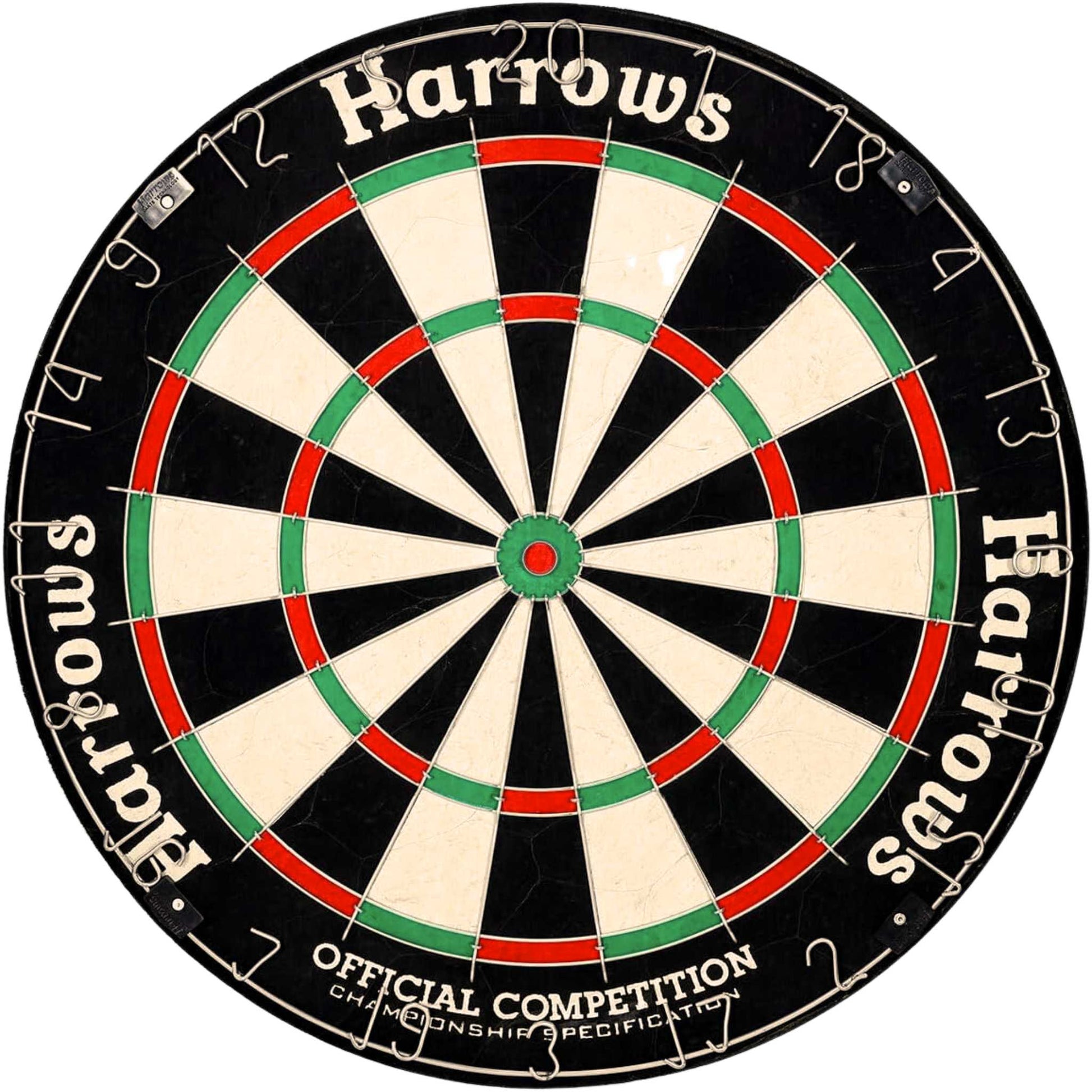 - Professional-Grade Dartboard: Includes the Harrows Official Competition bristle dartboard featuring a staple-free bullseye for reduced bounce-outs and maximized scoring potential