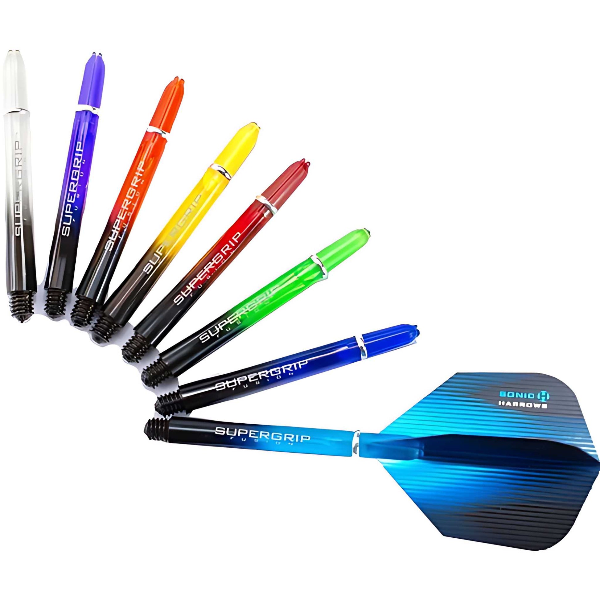 Vignette of colours that fade into black to give darts an uber cool, modern look. Available in short, midi, and medium lengths. Available in 10 colours: clear (CL), green (GR), purple (PUR), orange (OR), Aqua (AQ), red (RD), Yellow (YW), Blue (BL), Jade (JA), Dark pink (DPK).