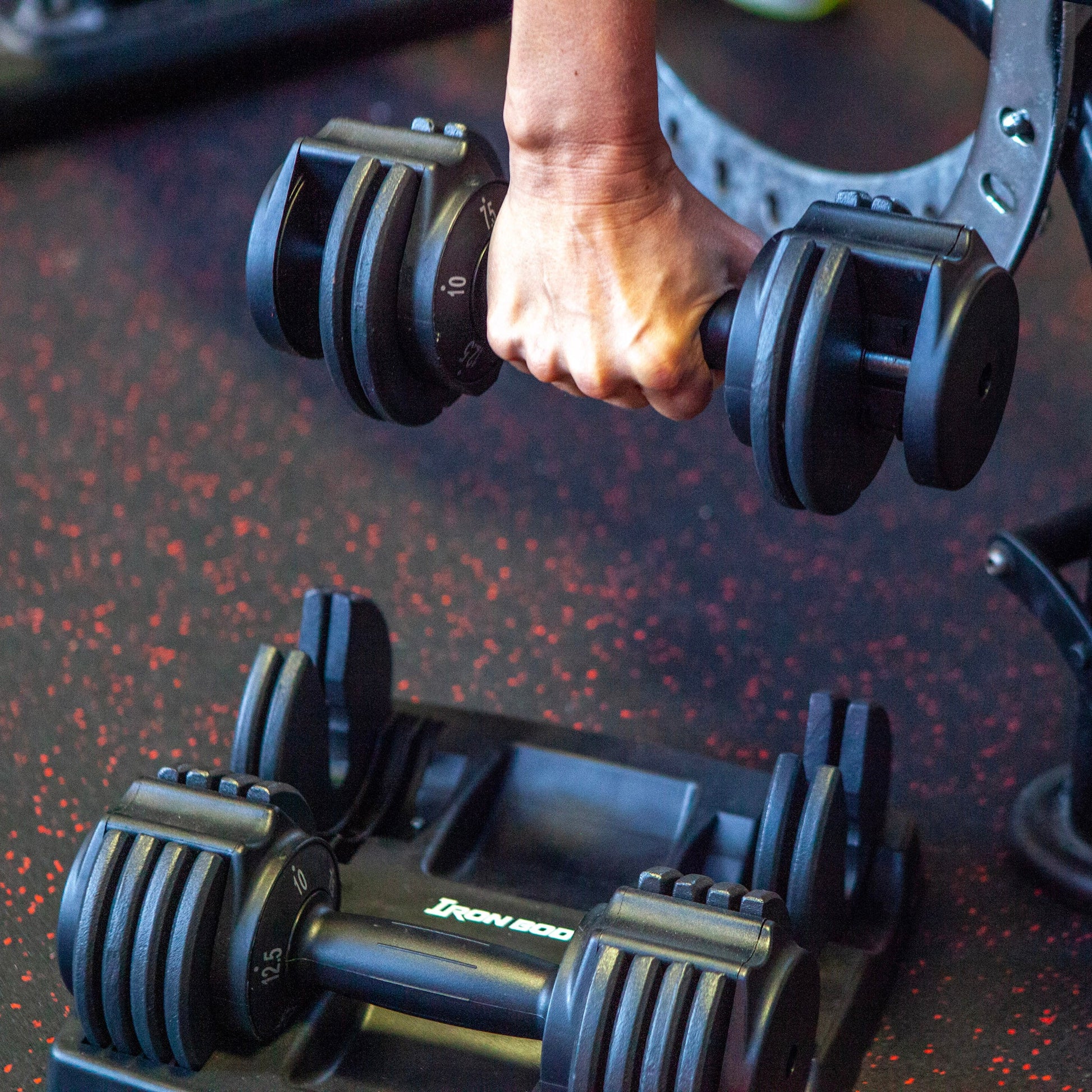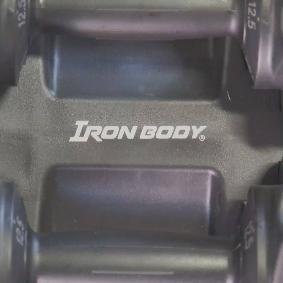 Build muscle and tone your body with the IBF Iron Body Fitness 25 lb. adjustable dumbbell set. The two 12.5 lb. dumbbells adjust with a simple turn of the handle in 2.5 lb. increments, allowing for quick and easy adjustments to 2.5, 5, 7.5, 10, or 12.5 lbs. per dumbbell. Replace five sets of dumbbells with one! This space-saving set is perfect for home workouts and comes with a heavy-duty docking base for secure weight adjustment and convenient storage.