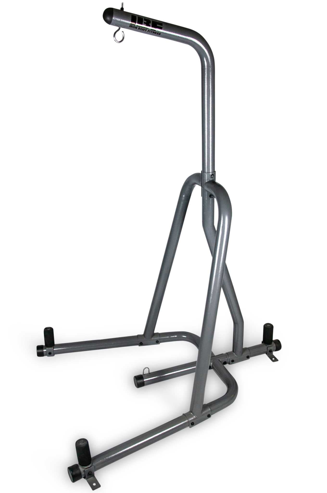 The IBF Iron Body Fitness heavy bag stand is the perfect accessory to keep your IBF heavy bag hanging tough. Designed for boxing, MMA, or fitness training, the extra-thick heavy-gauge 3” round steel frame sets it apart from other available stands. Screw-down plates for floor mounting and anti-slip base caps ensure stability, while the shortened rear support allows for complete movement around the stand. Ideal for home and light commercial use. Heavy bags are sold separately.