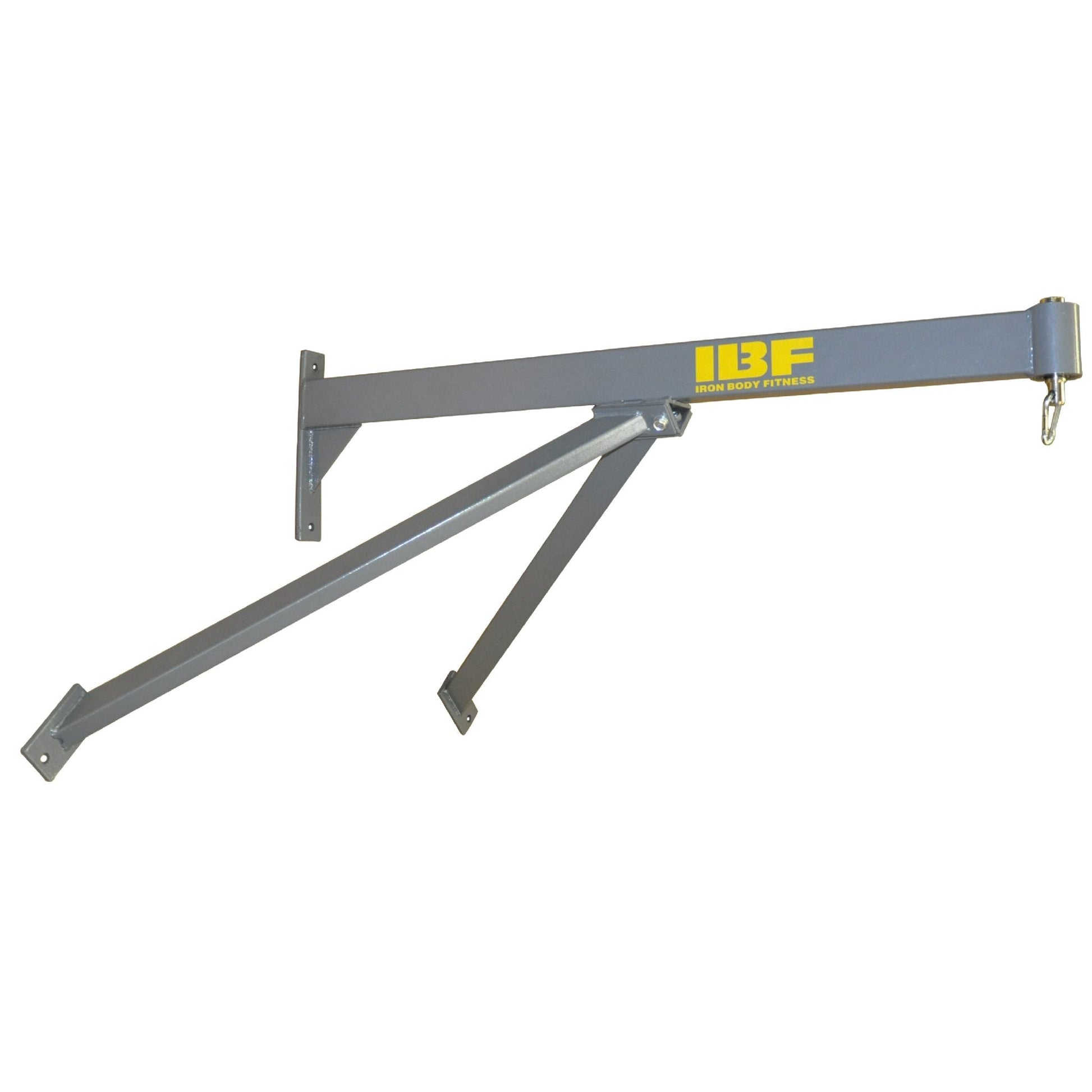The IBF Iron Body Fitness commercial-grade heavy punching bag wall mount is designed to hold a 75 lb., 100 lb., or 125 lb. punching bag. Constructed of heavy-duty steel, this premium wall mount features an extra-long wall extension that allows for free, unimpeded 360-degree movement around the bag. Ideal for commercial gym installations in Boxing, Muay Thai, Kickboxing, MMA training gyms, and condo residential gyms for intensive use. Mounts easily with six included bolts, making it a durable and reliable choice for high-performance environments.