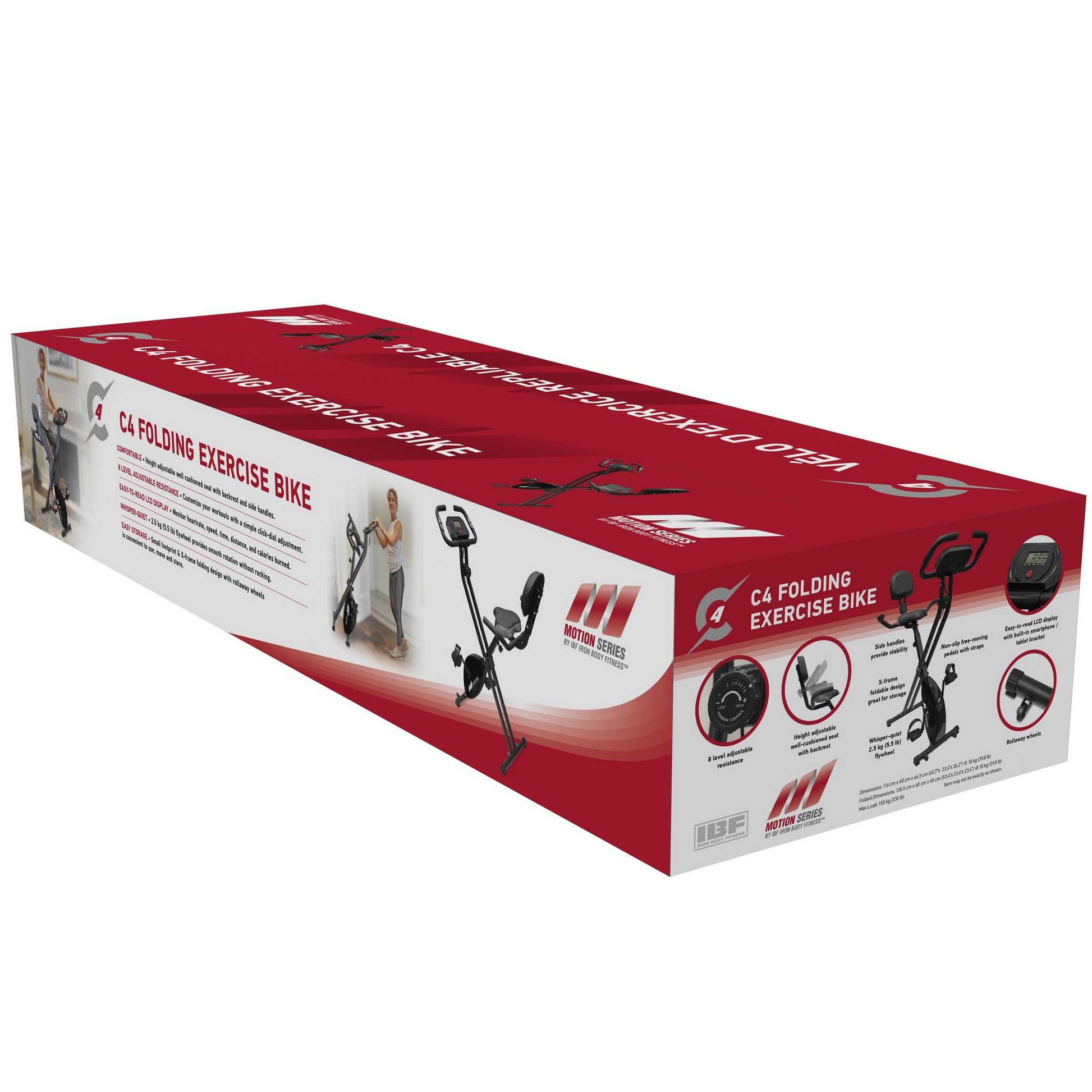 The Motion Series C4 Folding Exercise Bike by IBF Iron Body Fitness recreates the outdoor riding experience in the comfort of your home or office. Equipped with a whisper-quiet 2.5 kg (5.5 lb) flywheel and a cushioned seat, this bike ensures a smooth, comfortable ride for all fitness levels. Easily monitor heart rate, calories burned, and more on the LCD display, and use the built-in smartphone/tablet holder to enjoy entertainment while you exercise. The compact X-frame folding design with rollaway wheels makes it convenient to use, move, and store in tight spaces.
