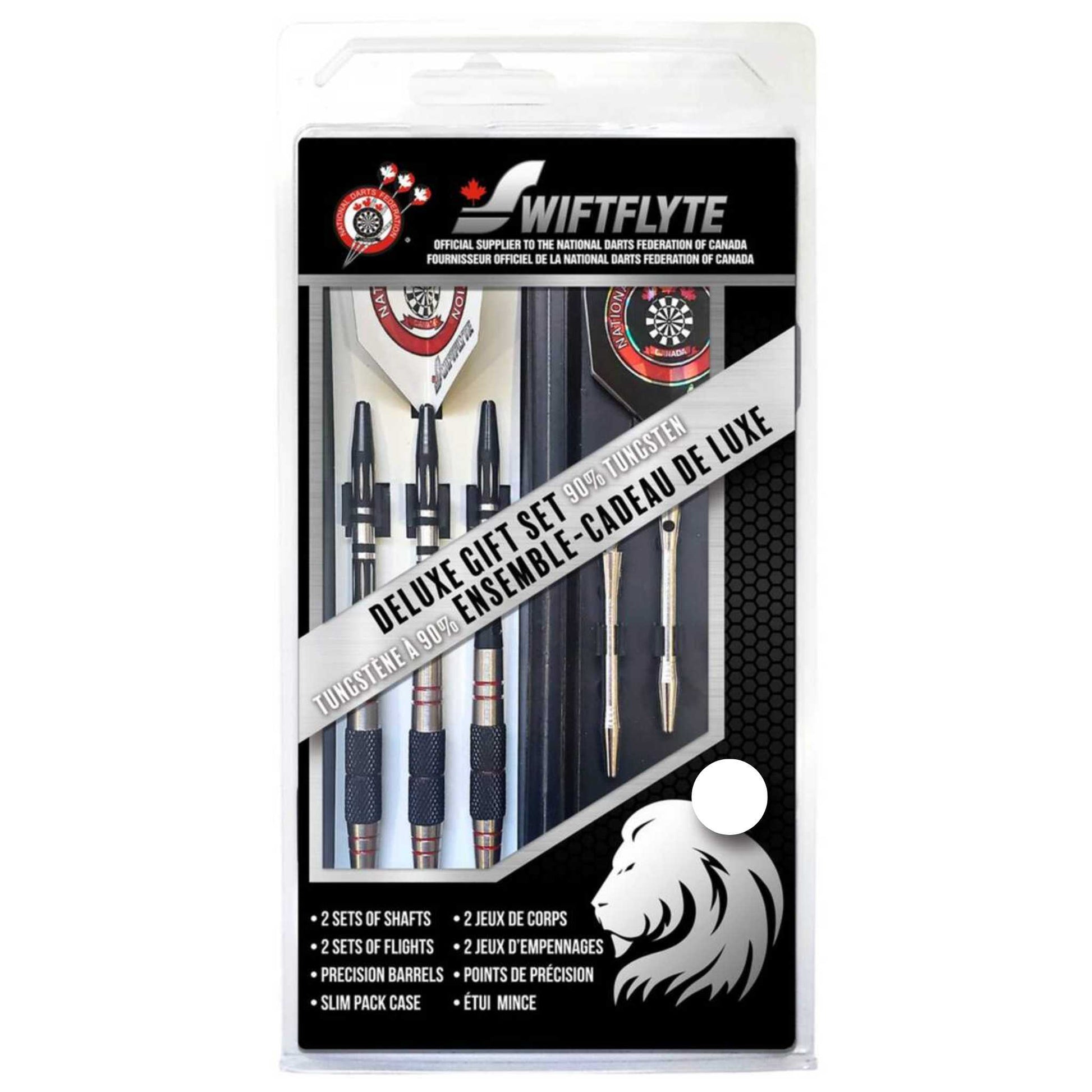 The Swiftflyte 90% Tungsten Dart Deluxe Gift Set is a must-have for any serious darts player. Its precision-cut, thin-profile barrels ensure an optimal flight arc and improved scoring potential. Paired with matching performance flights and premium aluminum shafts, this set offers a luxurious look and feel. As the official supplier to the National Darts Federation of Canada, Swiftflyte guarantees professional quality you can trust.