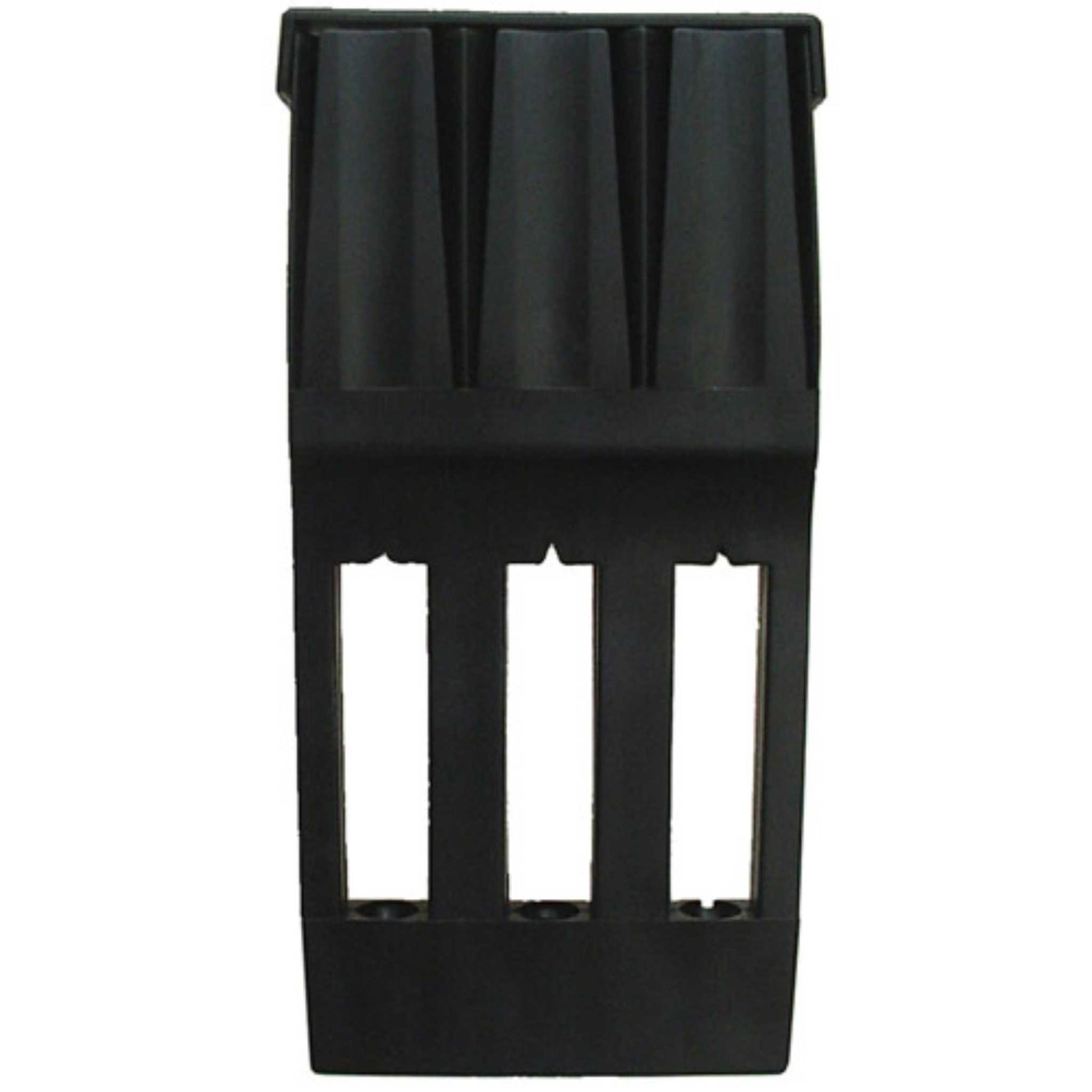 A convenient plastic dart protector designed to securely hold 3 darts without the need to remove the flights.