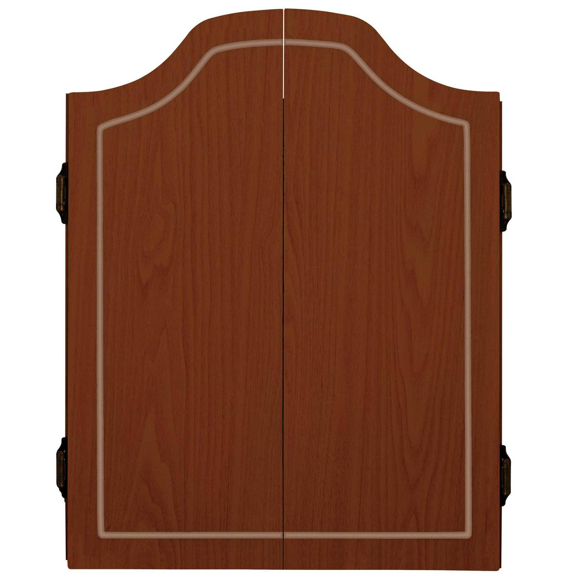 - Stylish, walnut brown veneer-finished MDF wooden cabinet which protects your walls from errant darts, with extra-spring hinges for smooth door operation and heavy-duty hangers for simple mounting