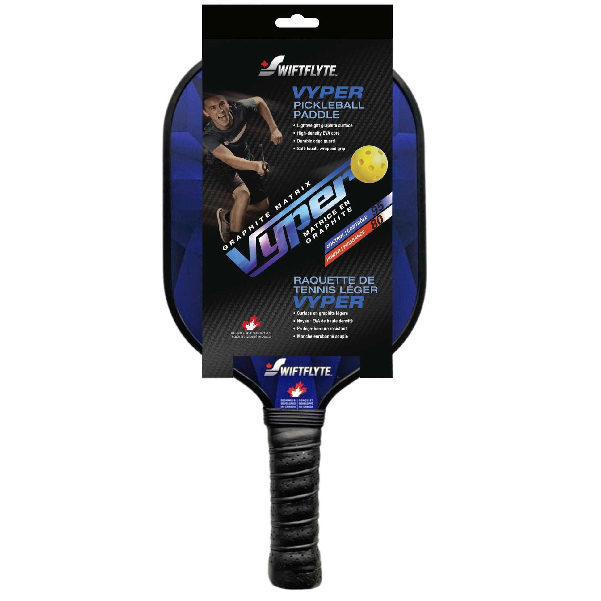 The Swiftflyte Vyper is a versatile Pickleball paddle that delivers the ultimate blend of power and control. Durable and lightweight, this paddle is engineered from a graphite matrix to deliver excellent deflection properties for effortless shots. The shock-absorbing inner core is constructed from high-density EVA for longer ball contact and better control. The wrapped soft-touch handle provides a comfortable grip and additional impact absorption. A durable edge guard protects against damage from accidental drops or hits.