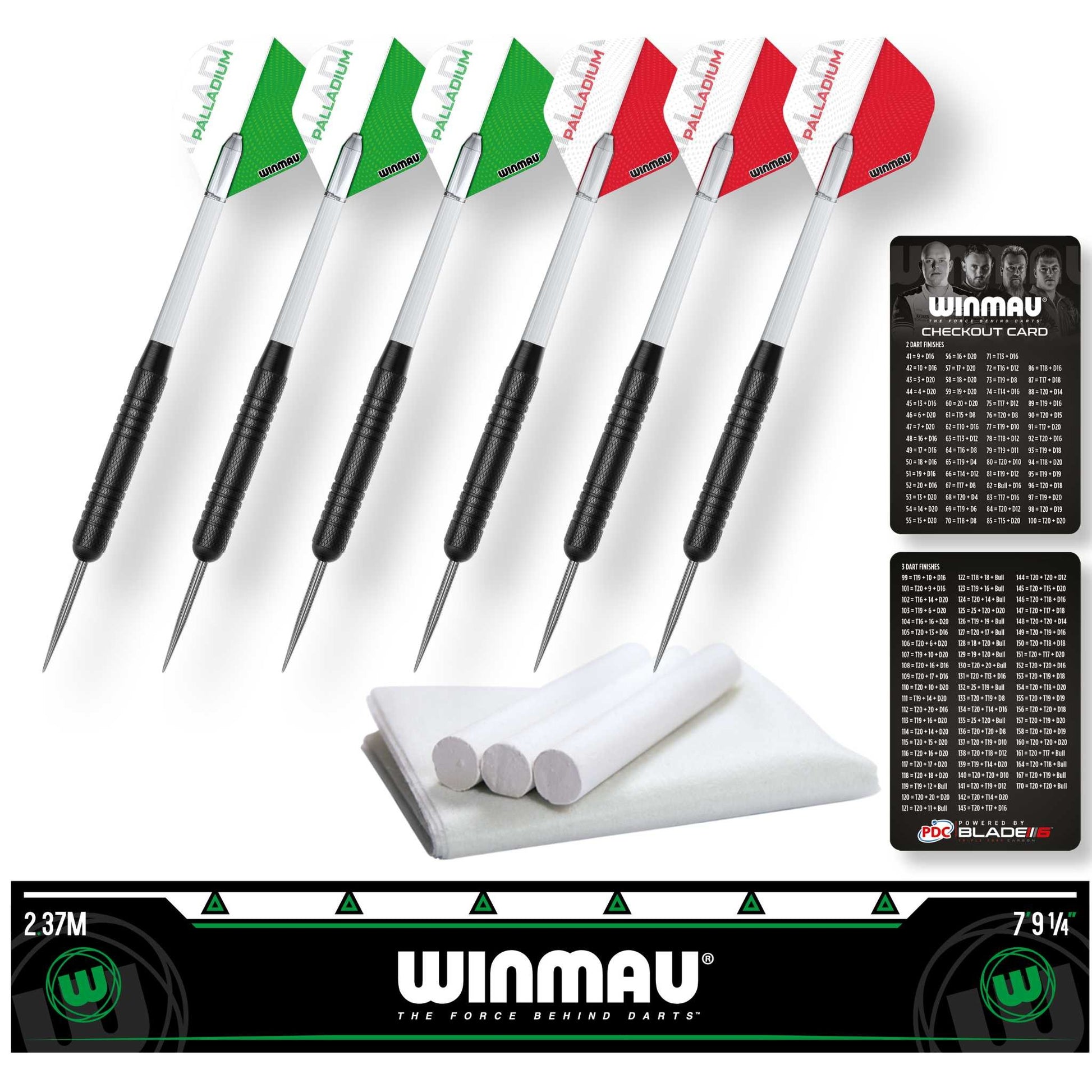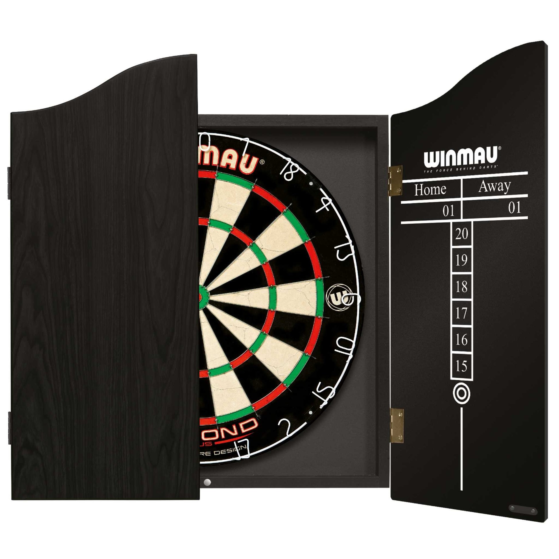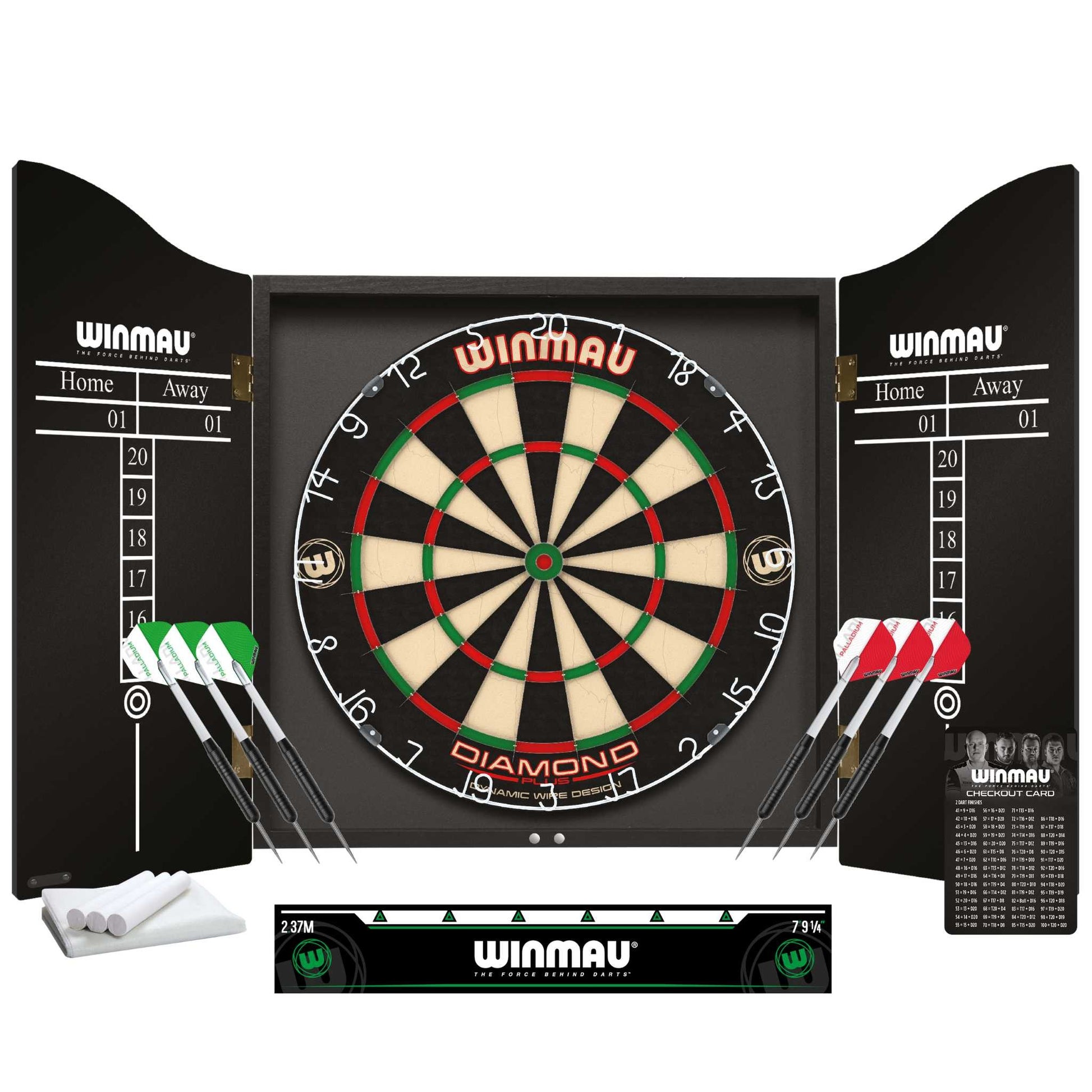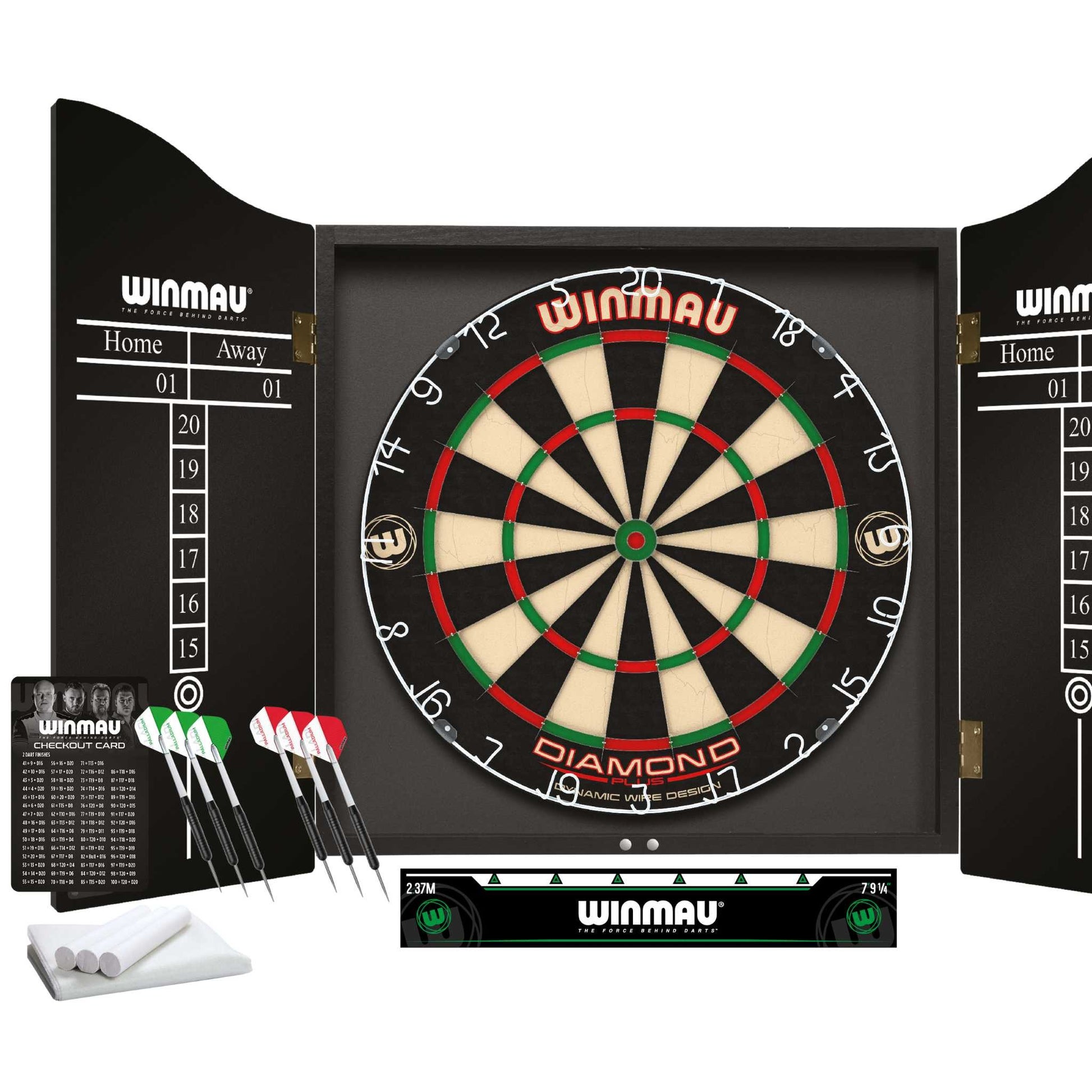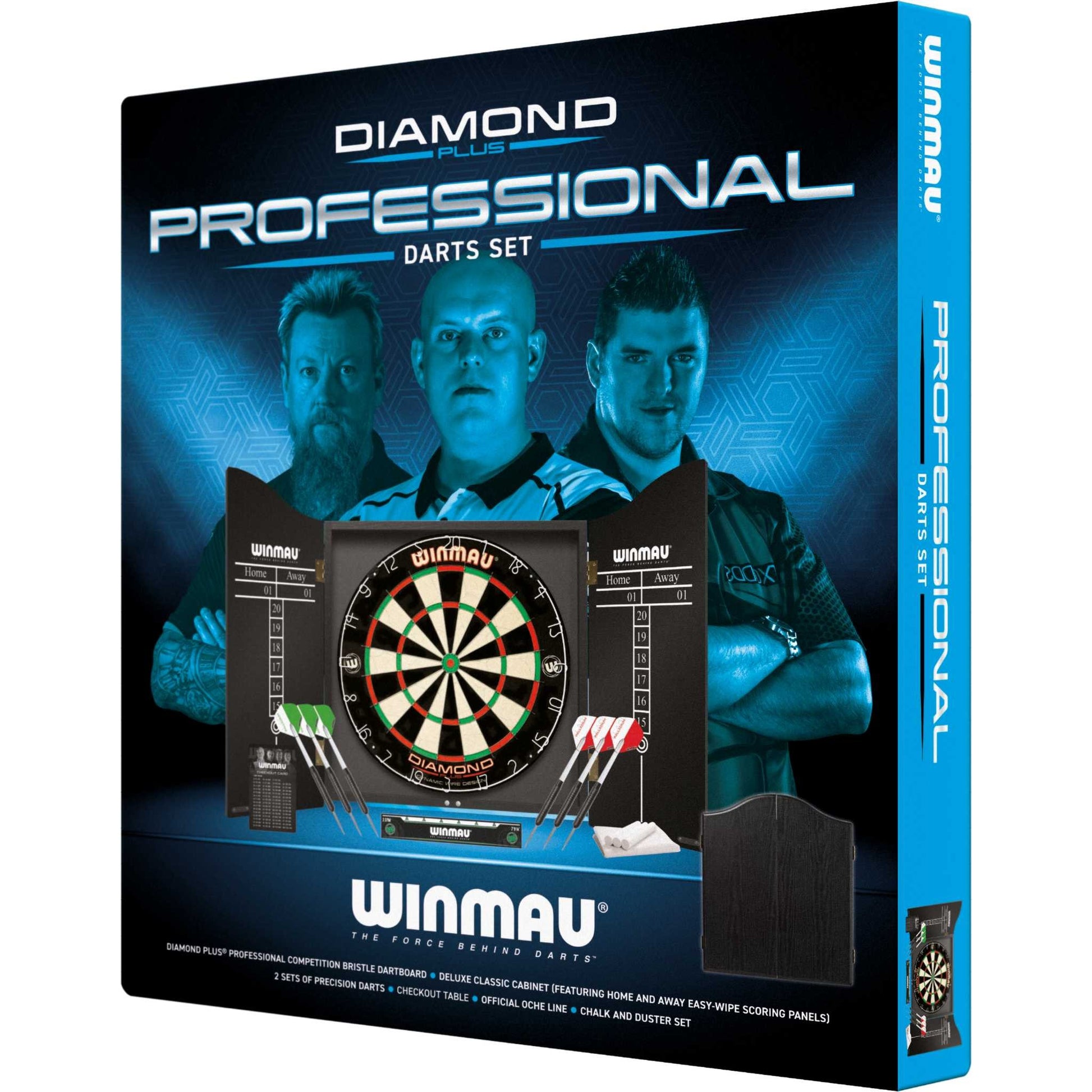 - The Winmau® Professional Darts Set is a complete ready-to-play darts setup which includes a premium Winmau® Diamond Plus bristle dartboard, stylish black-ash veneer-effect cabinet with pre-mounted scoreboards, two sets of three steel-tip darts, an official oche throw line, and more.