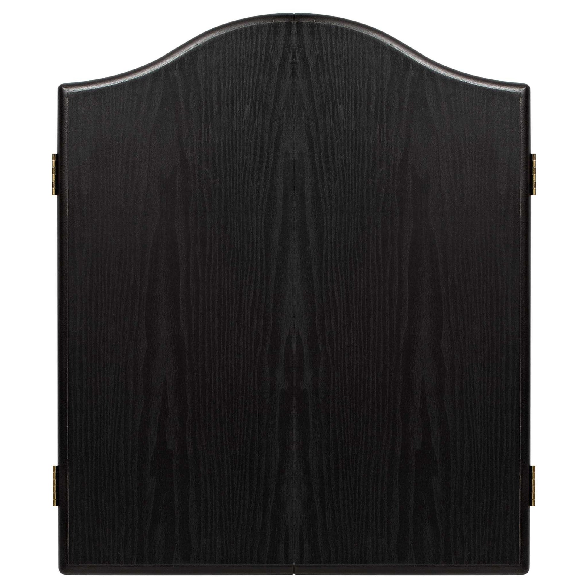 - The included cabinet features a stylish and elegant black-ash veneer-effect finish with a strengthened back panel, and it protects your walls from errant darts.